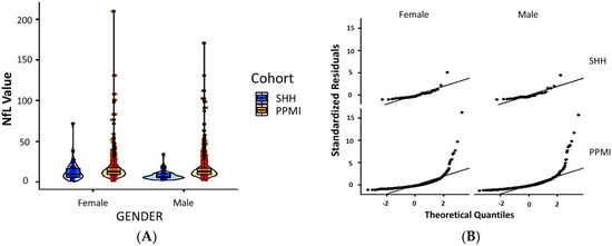 (A) Violin plot with imbedded boxplots showing the gender-stratified blood NfL value in the SHH and PPMI cohorts. (B) Graphical representation of the standardized residuals vs. theoretical quantiles of blood NfL values in females or males from the SHH and PPMI cohorts. SHH, Shuang Ho Hospital; PPMI, Parkinson’s Progression Markers Initiative.
