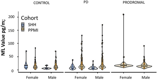 In the PPMI cohort, there was a total of 3156 eligible cases (male = 2052, female = 1104) with available serum NfL data, which were allocated to either the PD, control, or prodromal group, according to their clinical diagnoses. In PD group, there were 1248 males with mean NfL value 15.2 ± 11.2 pg/mL and 681 females with mean NfL value 15.8 ± 11.8 pg/mL. In the control group, there were 584 males with mean NfL value 12.4 ± 6.52 and 360 females with mean NfL value 12.7 ± 7.48. In the prodromal group, there were 220 males with mean NfL value 17.2 ± 9.23 and 63 females with mean NfL value 21.3 ± 24.8. The PD and prodromal groups exhibited higher serum NfL values, compared to the controls, regardless of gender.
