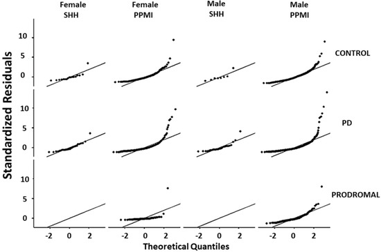 Graphical representation of the standardized residuals vs. theoretical quantiles of blood NfL values in control, PD, or prodromal cases from male or female participants in the SHH and PPMI cohorts. SHH, Shuang Ho Hospital; PPMI, Parkinson’s Progression Markers Initiative.
