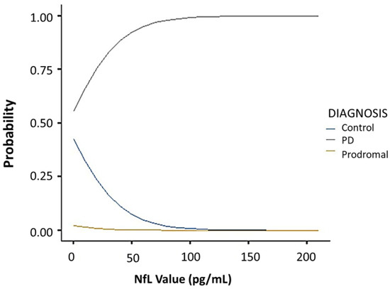 Confounding adjustment was carried out as previously described [33,34]. To adjust for confounders, we performed covariate-adjusted regression, wherein our outcome variable, namely, diagnosis of PD, was regressed on the exposure variables and covariates. Since the results’ validity relies on the correct specification of our regression model, we included all the covariates, interactions, and functions with probable influence on the exposure–outcome association. Upon meeting these conditions, the parameter associated with altered NfL levels determined the difference in the PD diagnosis by including NfL in any set of fixed values of other covariates