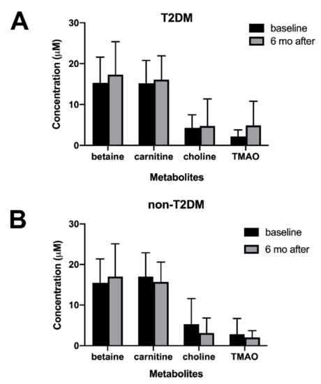 Serum levels of metabolites at baseline (black bars) and six months after bariatric surgery (gray bars) in (A) Type 2 diabetes mellitus (T2DM) and (B) non-T2DM patients. Abbreviation: T2DM, type 2 diabetes mellitus; TMAO. Trimethylamine-N-oxide.