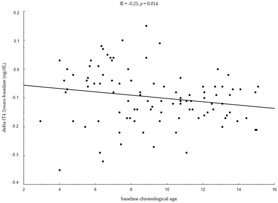 In a further analysis, we attempted to determine which baseline parameters influenced the decreases in fT4 levels observed after the initiation of rhGH therapy. We found that changes in fT4 levels, both in the first (ΔfT4 1year-baseline) and the second year (ΔfT4 2years-baseline) of treatment, were negatively associated with baseline chronological age (R = −0.21, p = 0.035; R = −0.25, p = 0.014 (Figure 1), respectively) and baseline bone age (R = −0.20, p = 0.047; R = −0.22, p = 0.026, respectively). Older children and children with a higher bone age had a greater decrease in fT4 levels during rhGH therapy. We did not find any correlations between ΔfT4 after the initiation of rhGH therapy and baseline height deficit, baseline HV, baseline nutritional status (weight SDS or BMI SDS) or with baseline GH deficit defined as the maximum GH peak in diagnostic tests and as baseline IGF-1 SDS values.