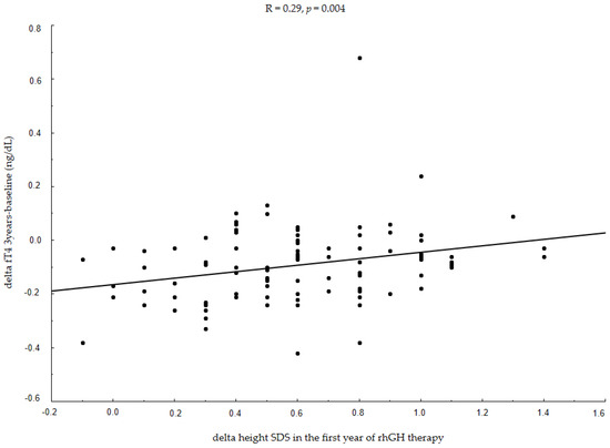 The next step in our analysis was to search for correlations between ΔfT4 during rhGH therapy and the response to that therapy defined as a reduction in height deficit (Δheight SDS) and an increase in IGF-1 SDS (ΔIGF-1 SDS). We found that children with a good growth response to rhGH therapy (higher Δheight SDS) had lower fT4 reduction during treatment. The changes in fT4 levels in the first three years of therapy (ΔfT4 3years-baseline) were significantly associated with a reduction in height deficit vs. baseline values (Δheight SDS) in the first (R = 0.29, p = 0.004, Figure 2), the second (R = 0.24, p = 0.018) and the third (R = 0.20, p = 0.043) year of therapy.