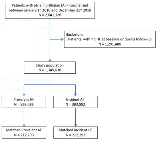 This retrospective cohort study was based on data from the French administrative hospital discharge database (Programme de Médicalisation des Systèmes d’Information; PMSI), which collects collected medical information according to the International Classification of Diseases, Tenth Revision (ICD-10), and medical procedures recorded according to the national nomenclature Classification Commune des Actes Medicaux (CCAM). The reliability of PMSI data has already been assessed, and this database has previously been used to study patients with cardiovascular conditions, including AF and HF [,,]. Use of medication was identified from a 1/97 permanent random sample of the complete French nationwide claims database (Echantillon Généraliste de Bénéficiaires, EGB—general sample of healthcare beneficiary. This sampling procedure has been previously used in patients with cardiac conditions with similar inclusion criteria (patients with AF and HF) [,,,]. Patients were considered to be included in a treatment group for a given class of drugs if they received a treatment from that class for ≥60 days within 6 months after discharge for the last event between AF or HF. The French Data Protection Authority granted access to the PMSI data, and procedures for data collection and management were approved by the independent national ethics committee for human rights in France (Commission Nationale de l’Informatique et des Libertés; CNIL), which ensures that all information is kept confidential and anonymous in compliance with the Declaration of Helsinki (authorization number 1897139).