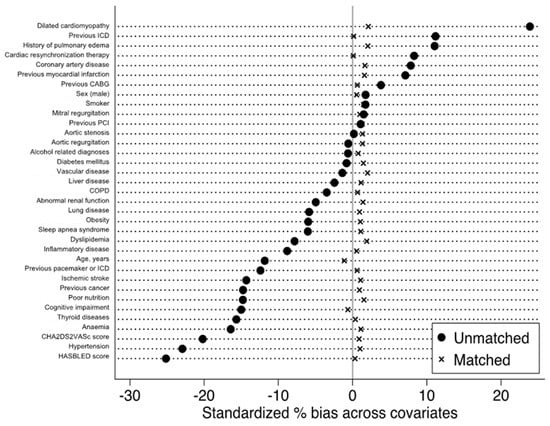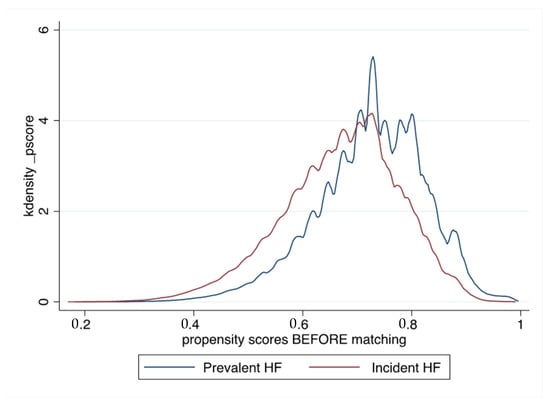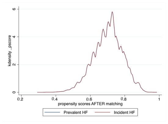 Qualitative variables are described as frequencies and percentages, and quantitative variables as means (standard deviations (SD)). Owing to the non-randomized nature of the study, and considering significant differences in baseline characteristics, propensity score matching was used to control for potential confounders of the treatment–outcome relationship. Propensity scores were calculated using logistic regression with history of HF at the time of AF (prevalent HF, i.e., HF previous or simultaneous to AF) as the dependent variable. The propensity score calculation included baseline characteristics listed in Table 1. Each AF patient with prevalent HF was matched with a patient with incident HF (1:1) using the one-to-one nearest neighbor method (with a caliper of 0.001 of the SD of the propensity score on the logit scale) and no replacement (Figure 2 and Figure 3). To test for matching procedure quality, we assessed the distribution of demographic data and co-morbidities in the AF first (incident HF) and HF first (prevalent HF) unmatched and matched cohorts with standardized differences, which were calculated as the difference in the means or proportions of a variable divided by a pooled estimate of the SD of that variable (proportion being considered as a continuous variable ranging from 0 to 1). For the outcomes analysis in the matched cohort, the incidence rates (%/year) for each outcome of interest during follow-up was estimated in the incident HF and prevalent HF groups and compared using hazard ratios (HR). We calculated delta CHA2DS2-VASc score in each patient for evaluating incident co-morbidities during follow-up []. p values are reported without and with correction for multiple comparisons using Bonferroni correction and considering 4 different comparisons. All comparisons with p < 0.05 were considered statistically significant. A two-sided p value of <0.05 was considered statistically significant. All analyses were performed using Enterprise Guide 7.1, (SAS Institute Inc., SAS Campus Drive, Cary, NC, USA) and STATA version 16.0 (Stata Corp, College Station, TX, USA).