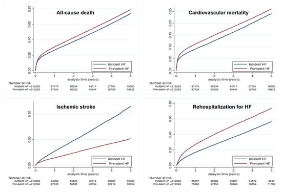 Cumulative incidences for all-cause death (top left panel), cardiovascular death (top right panel) and ischemic stroke (lower left panel) and re-hospitalization for HF (lower right panel) in the matched cohort of patients with AF and HF, with incident HF and prevalent HF.