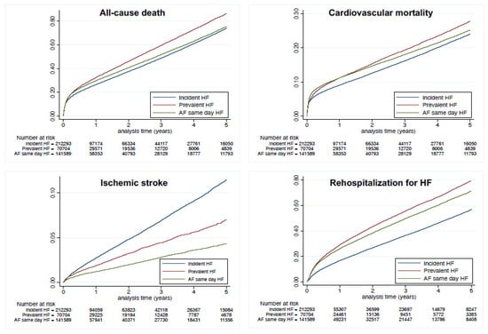 3.4. Outcomes in Patients with (1) Prevalent HF, (2) AF and HF Diagnosed during the Same Hospitalization or (3) Incident HF