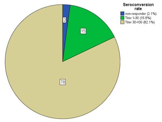 In the context of this global pandemic, numerous high-risk groups for severe clinical course after SARS-CoV-2 infection have been identified so far. Among these, end-stage renal disease patients (ESRD) on thrice weekly hemodialysis have been identified as an especially vulnerable patient population due to reduced possibility of self-isolation and the well-known impaired immune competence. Correspondingly high mortality rates between 16 and 37% have already been reported in this population from various countries and healthcare systems [4,5]. Although seroconversion rates in hemodialysis patients after two doses of SARS-CoV-2 vaccination have been reported well above the success rates of other conventional vaccination schemes e.g., for hepatitis B in this patient population, these response rates are still below those of the normal population [6,7,8]. The situation is further complicated by the fact that low-symptom infection courses have been reported in dialysis patients despite successful vaccination [9,10]. Furthermore, the questions as to which risk factors lead to a reduced response to vaccination in dialysis patients and whether a third booster-vaccination could lead to a successful formation of antibodies remain still unanswered. Therefore, this prospective multicenter cohort study was performed to investigate the response rates to standard SARS-CoV-2 vaccination schedules, search for risk factors for non-response, and evaluate the effectiveness of a third booster vaccination in non- or low-responders in a cohort of 95 chronic hemodialysis patients.