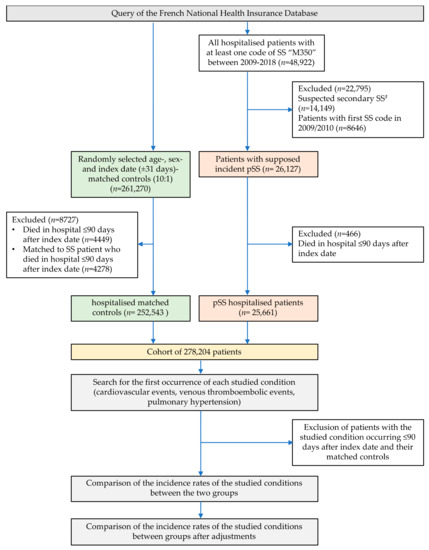 Therefore, this study aimed to describe the comparative incidence of major CVEs (IHDs, stroke, and heart failure) and PH in a real-life population of French hospitalised primary Sjögren’s syndrome (pSS) patients in comparison to age- and sex-matched controls.