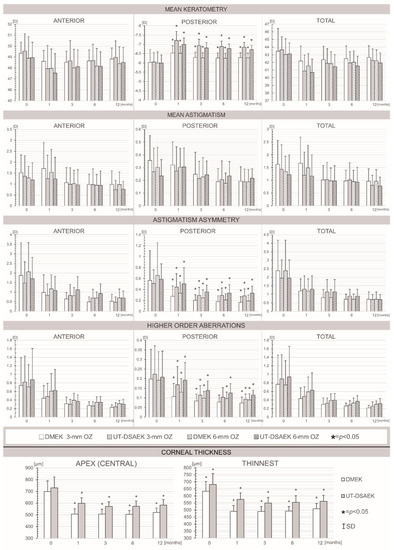 Bar graphs showing the pre- and postoperative mean values of the corneal parameters, which were evaluated using swept-source AS-OCT: mean keratometry, mean astigmatism, astigmatism asymmetry, higher-order aberrations and corneal thickness at the baseline and 1, 3, 6 and 12 months after Descemet membrane endothelial keratoplasty (DMEK) versus ultrathin Descemet stripping automated endothelial keratoplasty (UT-DSAEK) measured in 3 and 6 mm optical zones (OZs). * p < 0.05.