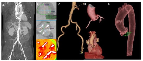Pre-TAVI work-up MSCT analysis. (A) Transfemoral route: from skin to valve MSCT analysis. (B) Aortic valve MSCT analysis. (C) 3D reconstruction of femoral vascular accesses. (D,E) 3D reconstruction of aortic root, aortic arch, and descending aorta.