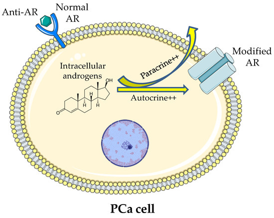 The resistance to the treatments showed by PCa could be due to an adaptive mechanism of microenvironment. In addition, PCa cells might be able to produce androgens and modify the AR, which allows the maintenance of the signalling even in the presence of low serum testosterone [107] (Figure 1).