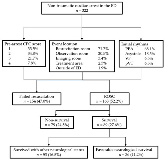 We collected a total of 322 patients with non-traumatic cardiac arrest in the ED. Male gender was predominant (68.6%), and 16 (5.0%) had had an initial OHCA event, and was referred to the ED after successful resuscitation in other hospital. The pre-arrest cerebral performance category (CPC) scores of 1, 2, 3, and 4 accounted for 33.5%, 34.8%, 21.7%, and 7.8% of the patients, respectively. Most of the cardiac arrests occurred in the resuscitation room (71.7%), followed by the observation room (20.5%), and the imaging room (3.4%). Six (1.9%) cardiac arrest events occurred outside of the ED when patients were transferred to scope rooms or radiology department for diagnostic/interventional procedures. The most common initial rhythms were pulseless electrical activity (68.1%), followed by asystole (18.3%), ventricular fibrillation (6.5%), and pulseless ventricular tachycardia (6.5%). One hundred and sixty-eight patients (52.2%) were successfully resuscitated (defined as recovery of spontaneous circulation (ROSC) for at least 20 min), and in 3 patients the resuscitation effort was stopped due to DNR order before or after this event. Eighty-nine patients (27.6%) survived to discharge, while 36 patients (11.2%) had favorable neurological outcomes (CPC of 1 or 2) at discharge. A total of 44 patients (13.7%) survived for more than one year, and the majority of these patients (32, 72.7%) had favorable neurological outcomes. A flowchart of baseline characteristics and outcomes is illustrated in Figure 1.