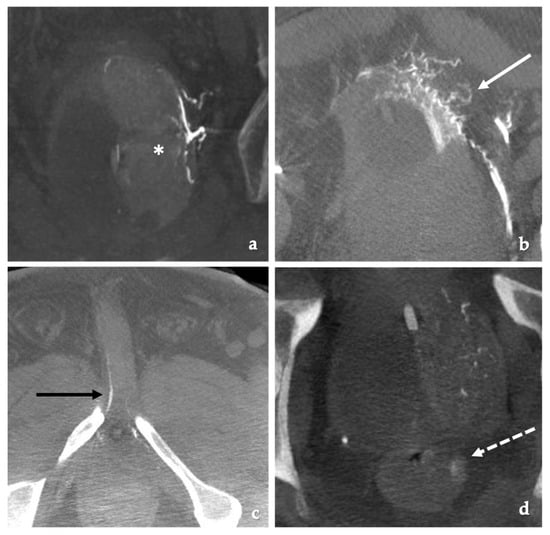Many prefer the use of CT due to the speed of acquisition, spatial resolution and the ability to visualize very small arteries (Figure 1) [,,]. CT angiography may also help identify the origins of the prostatic artery, which can be one of the more challenging steps in the procedure [].