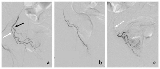 Coil embolization of extra-prostatic arteries. (a) The middle rectal artery (white arrow) and prostatic artery (black arrow) share a common trunk with short distance between middle rectal artery and prostatic artery. To safely embolize the prostatic artery with particles, the middle rectal artery can be embolized with coils, (b) Selective injection of the middle rectal artery prior to coil embolization, (c) DSA imaging of the prostatic artery after coil embolization (white dotted arrow) of the middle rectal artery shows filling of the prostate without filling of the rectum. Following these steps, the prostatic artery can now safely be embolized with particles.