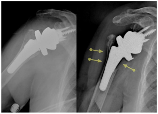 18]. Severe stress shielding with resorption of the greater tuberosity, and in extreme cases in areas of complete cortical defect, has been reported with the implantation of larger sizes of certain stems, and malalignment may accentuate these adverse bone reactions through point contact of the stem on the cortical bone, further shielding the proximal bone from stress (