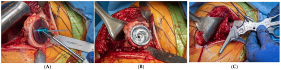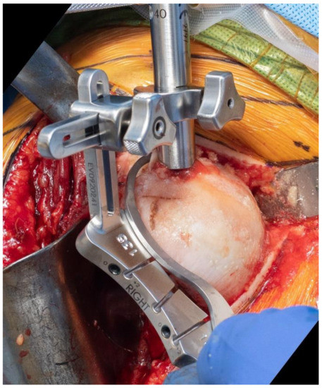 Many surgeons are used to performing the humeral head osteotomy with so-called freehand techniques. However, for those implants with a fixed neck–shaft angle, it may be advantageous to use an extramedullary or an intramedullary guide. Our preference is to use an intramedullary guide, and the selection of the entry point of the guide is paramount to avoid a varus or valgus cut. A C–guide may then be used to select the ideal cut height (