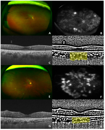 Two representative cases (ultra-wide-fundus photo, ultra-wide-fluorescein angiography, optical coherence tomography, and binary image of optical coherence tomography) showing choroidal thickening and thinning in treatment-naïve eyes with proliferative diabetic retinopathy (PDR). (A–D) Representative case of a 73-year-old woman with a high choroidal vascularity index (CVI, 0.723%; subfoveal choroidal thickness, 342 μm) in the eyes; (E–H) representative case of a 50-year-old man with a low CVI index (CVI, 0.653%; subfoveal choroidal thickness, 214 μm) in the eyes.