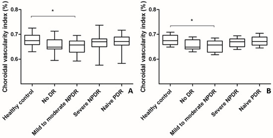 Changes in choroidal vascularity index (CVI) according to the severity of diabetic retinopathy (DR). (A) The mean CVI of eyes with mild-to-moderate NPDR was significantly lower than that of healthy control eyes (analysis of variance, post hoc * p = 0.045). The mean CVI of eyes with treatment-naïve PDR and severe NPDR were higher than that of eyes with mild-to-moderate NPDR and no DR. However, the changes were not significant as indicated by a post hoc analysis. Data are shown as mean ± standard deviation. (B) Age-adjusted changes in CVI were similar to the changes in CVI without adjustment (analysis of covariance, post hoc, * p = 0.042). Data are shown as mean ± standard error. CVI; choroidal vascularity index; DR, diabetic retinopathy; NPDR, non-proliferative diabetic retinopathy; PDR, proliferative diabetic retinopathy.