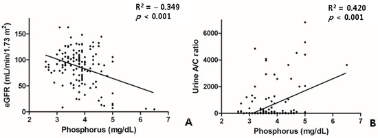Scatter plot showing relationship between the phosphorus level and the renal profiles of eGFR (A) and the urine A/C ratio (B). A/C, albumin/creatinine; eGFR, estimated glomerular filtration rate.