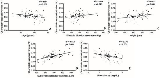 Scatter plot between choroidal vascularity index (CVI) and several parameters that showed statistical significance in univariate linear regression. (A,E) Age and serum levels of phosphorus were negatively correlated with CVI. (B–D) Subfoveal choroidal thickness, body height, and diastolic blood pressure were positively correlated with CVI.