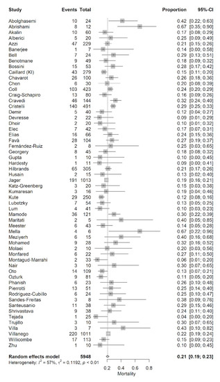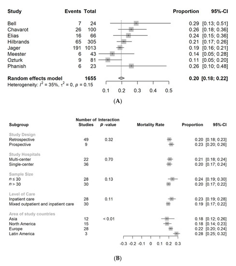 The sensitivity analysis was performed by including only studies with a low risk of bias (NOS scale higher or equal to 7). A total of eight studies fulfilled this criterion. The pooled mortality was 20% (95% CI: 18−22%) with low heterogeneity (I2 = 35%, p = 0.15). (Figure 3A).
