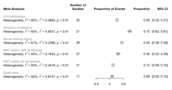 Thirty-two studies reported the rate of ICU admission. The pooled ICU admission rate was 26% (95% CI: 22−31%) with moderate heterogeneity (I2 = 80%, p < 0.01). The rates of IMV among patients requiring ICU care were reported in 21 studies. The pooled IMV rate was 72% (95% CI: 62–81%) with moderate heterogeneity (I2 = 65%, p < 0.01). The incidence rate of AKI was reported in 38 studies, with a pooled rate of 44% (95% CI: 39−49%) and moderate heterogeneity (I2 = 61%, p < 0.01). The requirement of KRT among patients experiencing AKI was reported in 27 studies. The pooled KRT rate among AKI patients was 30% (95% 22−39%) with high heterogeneity (I2 = 83%, p < 0.01), and was 12% (9−15%) with high heterogeneity (I2 = 83%, p < 0.01) among the whole-kidney transplant population. The rate of graft loss was reported in only 11 studies. The pooled graft loss rate among kidney transplant COVID-19 survivors was 8% (95% CI: 5−15%) with a high heterogeneity (I2 = 87%, p < 0.01). The summarized and detailed information of these secondary outcomes is depicted in Figure 2.