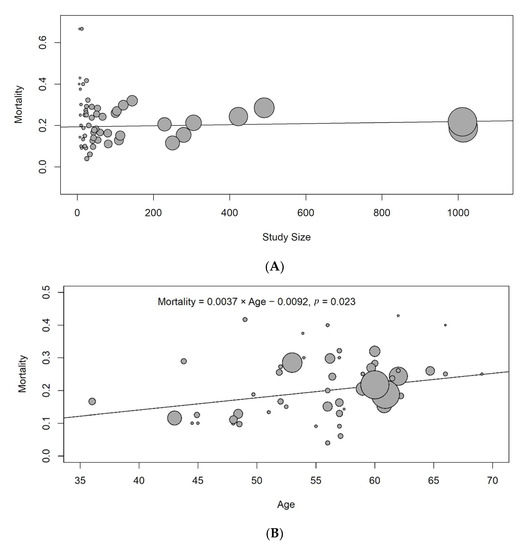 A meta-regression was performed to examine the relationship between two covariates (sample size and age) and mortality. Sample size was not significantly associated with increased mortality risk (Figure 4A). The mortality rate was significantly associated with older age (mortality rate = 0.0037 × Age − 0.0092, p value = 0.023). This implies a 3.7% increase in mortality rate for every 10 years of age (Figure 4B).