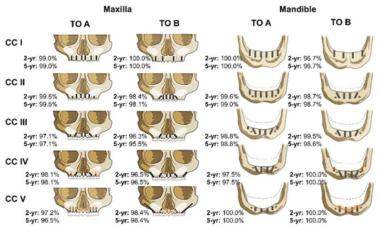 Follow-up times for maxillary and mandibular TCs ranged from 2.6 ± 2.1 (IV B) to 4.1 ± 2.6 (II B) years and from 1.4 ± 0.0 (II C) to 8.5 ± 0.4 (V B) years, respectively.