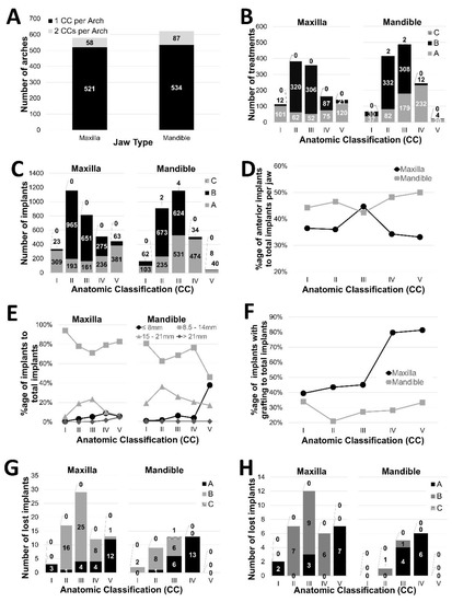 (A) Number of different CCs per maxillary and mandibular arch. (B,C) Total number of treatments (B) and implants (C) per treatment category. (D) Relative %age of anterior implants to total implants per CC. (E) Relative distribution of implants per CC as a function of implant length (short implants (≤8 mm), regular implants (8–14 mm), long implants (15–21 mm) and zygomatic implants (>21 mm)). (F) Frequency of bone grafting per CC. (G,H) Total number of failed implants (H) and total number of failed implants in patients that lost ≥ two implants (G) as a function of TC, respectively.
