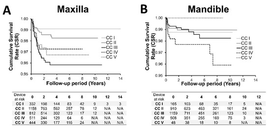 Kaplan–Meier plot, cumulative survival rates for (A) maxillary implants and (B) mandibular implants as a function of anatomical classifications according to Carames et al., (CCs).