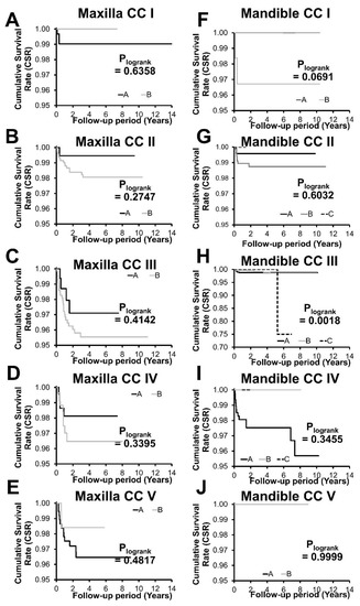 Kaplan–Meier plot, cumulative survival rates of maxillary (A–E) and mandibular (F–J) implants placed in individual anatomical classifications (CC I–V, individual graphs) as a function of TOs (A–C).