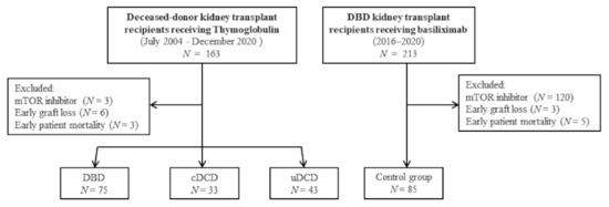 This is a retrospective patient cohort study including deceased-donor KT recipients who underwent KT between July 2004 and December 2020 at the Hospital del Mar, Barcelona, Spain. Initially, and to avoid potential confounders, only those recipients who received induction immunosuppression with thymoglobulin were selected (n = 163). Patients who received maintenance immunosuppression with mammalian target of rapamycin (mTOR) inhibitor instead of mycophenolic acid (n = 3), patients with immediate graft loss (n = 6), and those who died in the early post-transplant period (n = 3) were excluded from the analysis. A total 151 patients were analyzed, and of those: 43 recipients from uDCD who receive induction with thymoglobulin by protocol in our center; 33 KT recipients from controlled DCD (cDCD); and 75 KT from DBD -who receive thymoglobulin for high immunological risk-. Maintenance immunosuppression consisted of tacrolimus, mycophenolic acid, and prednisone. To be noted, tacrolimus had a delay-start among uDCD KT recipients, initiated between 3 and 5 days after transplant. Then, we added a control group of 85 DBD KT recipients (2016–2020) who received immunosuppression induction with basiliximab and maintenance with tacrolimus, mycophenolic acid, and prednisone. Figure 1 shows the patient’s flow-chart. Patients were followed-up for 3 months after transplantation.