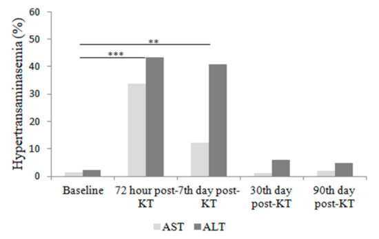 Percentage of patients with elevated transaminases above normal values at different time-points related to transplantation. Comparisons to baseline were made with McNemar test. Differences were found in AST and ALT levels at 72 h and 7 days post-KT. ** p < 0.01; *** p < 0.001.