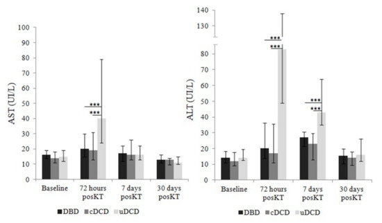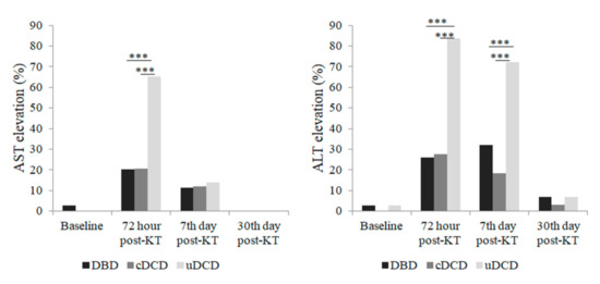 Percentage of patients with elevated AST or ALT according to donor type (only those recipients who received thymoglobulin). Comparisons between groups were made with Chi-Square test. Differences were found in the uDCD group at 72 h post-KT (AST levels) and at 72 h and 7 days post-KT (ALT levels). *** p < 0.001.