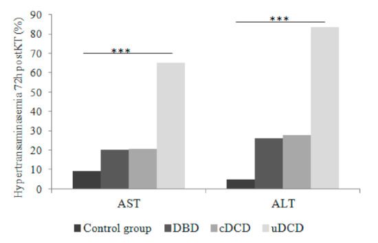 Percentage of KT recipients presenting hypertransaminasemia during the early posttransplant period according to the donor type. Comparisons with the control group. Comparisons between groups were made with Chi-Square test. Differences were found only between the control group and the uDCD group for both AST and ALT. *** p < 0.001.