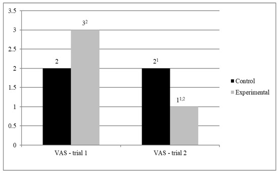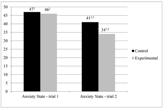 Average anxiety as a state (STAI). 1—in the 2nd trial state anxiety in the treatment condition was significantly lower than in the control condition (p < 0.05). 2—significant difference between trial 1 and 2 in treatment condition (p < 0.05). 3—significant difference between trial 1 and 2 in control condition (p < 0.05).