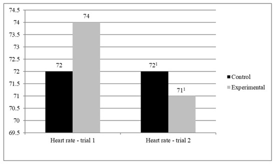 Average heart rate. 1—in the 2nd trial heart rate in the treatment condition was significantly lower than in the control condition (p < 0.05).