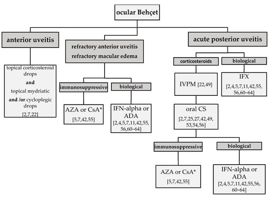 Proposed choice of therapeutic options, depending on the localization and severity of ocular inflammation. AZA—azathioprine; CsA—cyclosporine A (*)—NOT in the parenchymal neurological and ocular phenotype [,,]; IFN-alpha—interferon alpha; ADA—adalimumab; IFX—infliximab; IVPM—intravenous pulse methyl prednisolone; CS—corticosteroid.