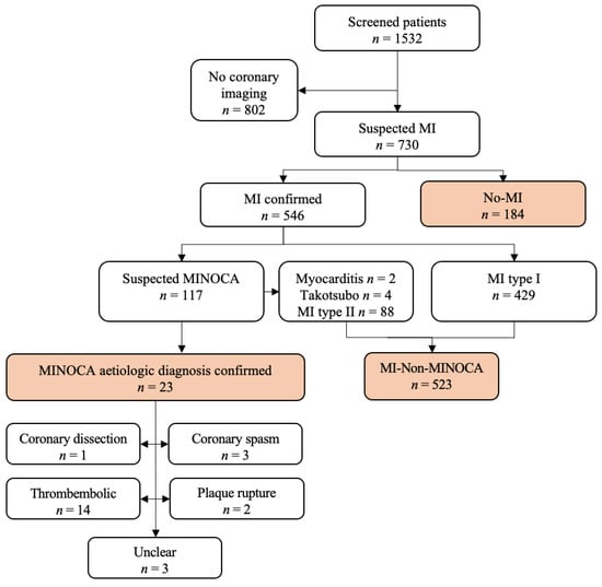 Study flow. MI, myocardial infarction; MINOCA, MI with non-obstructive coronary arteries.