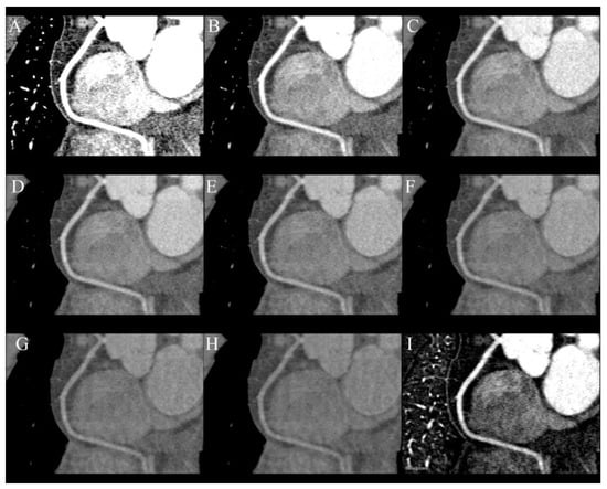 Series of curved MPR of RCA at different energy VMIs: (A)—40 keV, (B)—50 keV, (C)—60 keV, (D)—70 keV, (E)—80 keV, (F)—100 keV, (G)—120 keV, (H)—140 keV. The best contrast to noise ratio is at 60–70 keV images (C,D) Lower energies have higher iodine density but also much higher noise. Higher-energy VMIs (F–H) are less useful due to low contrast density. (I)—curved MPR reconstructed from iodine(water) map can also be used to assess lumen of RCA.
