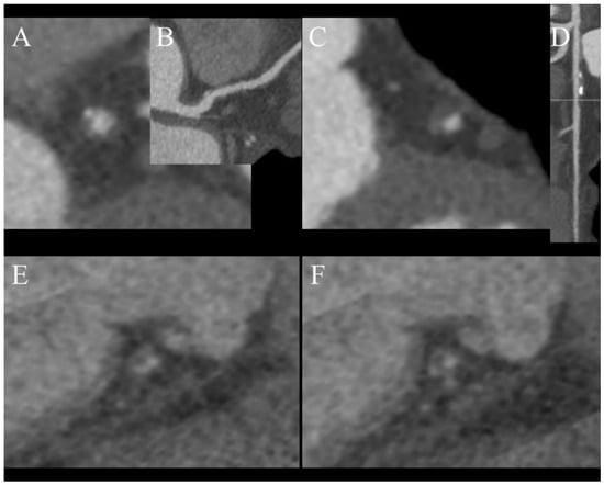 Figure 4. Features of venerable plaques. (A,B)—spotty calcification—calcification smaller than 3 mm and less than 150% lumen diameter (A)—short axis view, (B)—curved MPR of the vessel; (C,D)—positive wall remodeling—outer diameter of involved section of the vessel at least 110% of non-involved part of vessel; (E,F)—both plaques are noncalcified and low density (<30 HU) corresponding to cholesterol reach core, (F)—napkin ring sign—hyperdense outer part of noncalcified plaque. - Positive remodeling (Figure 4C,D);
