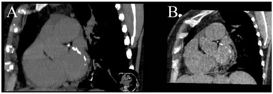 There are three causes of contrast filling defects of heart chambers in coronary CTA: a thrombus, a tumor or a blood flow artefact. The first two require further diagnostic investigation due to different treatments. The most common location of contrast filling defects in patients with atrial fibrillation is the left atrial appendage (LAA); it is also the most common location of intracardiac thrombus. Definite differentiation is possible by performing an additional scan in the venous phase but has the disadvantage of additional radiation dose; definite differentiation can also be achieved by transesophageal echocardiography (TEE). DECT, by using low-energy VMIs or iodine(water) maps can detect even minimal concentrations of iodine in LAA and exclude the presence of thrombus. The measurements of iodine concentration are more accurate than the density of LAA, as it is carried out in SECT (Figure 7A–D) [9,64], and as proven by Hur et al., using 1.74 mg I/mL as the cutoff value for thrombus has 100% specificity. The third cause of the filling defect is the presence of a tumor in the chamber of the heart. As proven by Hong et al., it is possible to differentiate tumors and thrombus using dual-energy coronary CTA by measuring the iodine concentration [65,66].