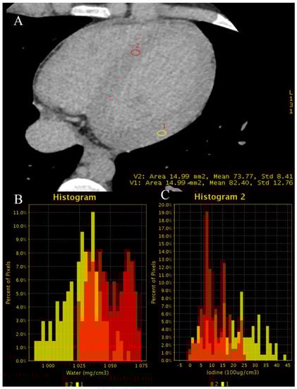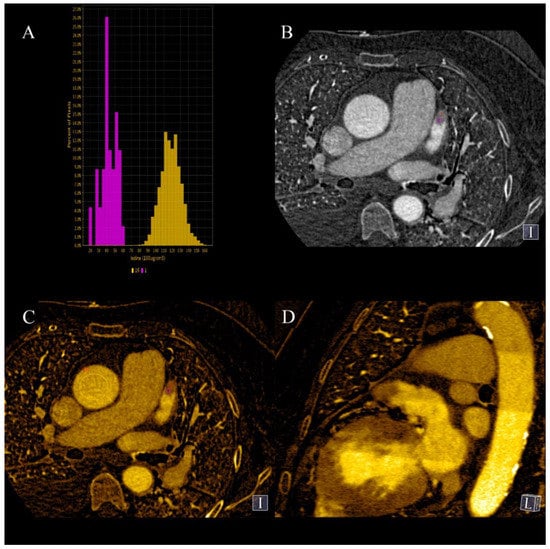 (A–D). Case of patient with chronic atrial fibrillation after 3 unsuccessful ablations, currently admitted due to chest pain. Coronary CTA was performed to roll out coronary artery stenosis. Differentiating thrombus and filling defect of LAA using iodine concentration is much more specific and sensitive than the use of Hounsfield unities ratio, as proven by Hur et al. [64]. (A)—Histogram of iodine concentration in ROIs; (B)—map iodine(water) shows lower concentration of iodine in LAA of about 4.1 mg/mL, meeting the criteria for circulatory stasis by Hur et al.; (C,D)–70 keV VMI with color overlay of iodine(water) map. (D)–in log axis of LAA. In the lower right corner of sub-image B-C-D information about viewpoint.