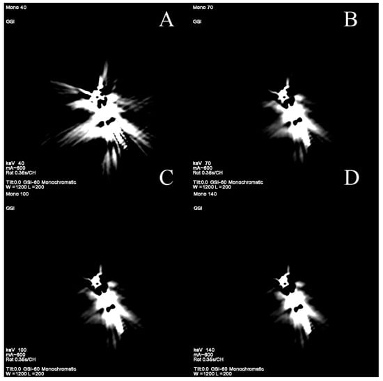 The beam hardening artifact occurs when a polychromatic X-ray beam passes through a high-density structure, which absorbs disproportionally more low-energy photons than high-energy ones. This disproportion generates hyper- and hypodense streaks on reconstructed images [5,69,72]. VMIs are much more resistant to these artifacts because they simulate images obtained with photons of single energy—is it not possible to harden that beam, only to attenuate it.