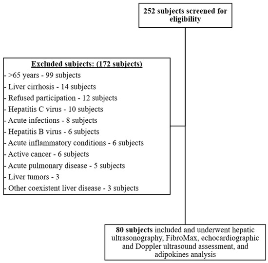 Currently, the literature lacks studies evaluating serum adiponectin and visfatin levels in MAFLD patients using the newly defined criteria. Moreover, adiponectin and visfatin were both found to be associated with CVD, being responsible for most deaths among fatty liver disease patients, mainly due to ischemic heart disease [27,28]. Therefore, we conducted an observational cross-sectional study aiming to evaluate serum adiponectin and visfatin levels in MAFLD patients vs. controls, as well as their possible associations with cardiovascular parameters assessed by echocardiography and Doppler ultrasound. We hypothesized that adiponectin and visfatin can predict cardiovascular risk, mainly systolic and diastolic dysfunctions.