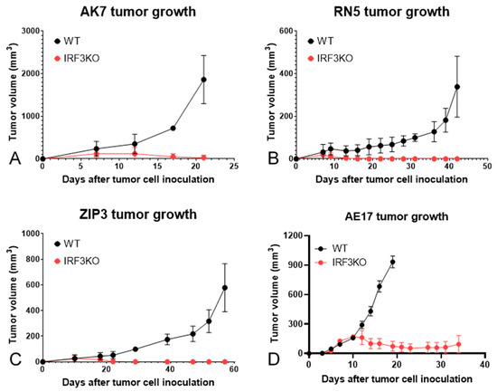 Tumor growth curves of murine mesothelioma in wild-type (WT) vs. IRF3KO mice. Tumor volumes were plotted as a function overtime. (A). AK7; (B). RN5; (C). ZIP3; and (D). AE17.
