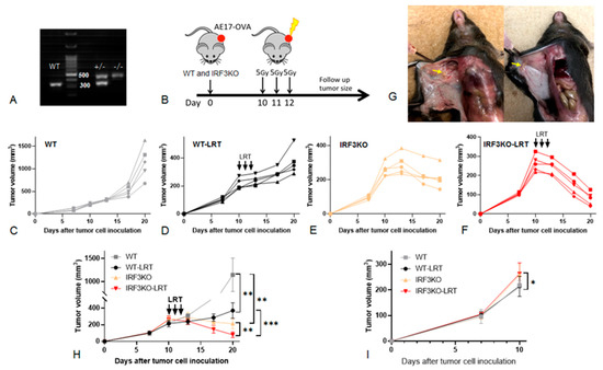 In vivo tumor growth experiments of AE17. (A) Genotyping of IRF3KO mice. There were mutant IRF3 heterozygous (IRF3+/−) and homozygous mice (IRF3−/−). Only IRF3−/− mice were used in our experiments as IRF3KO mice. (B) Experimental design. Mice were divided into four groups: WT-LRT group, WT group, IRF3KO-LRT group and IRF3KO group (n = 5 per group). LRT was given to WT-LRT and IRF3KO-LRT groups with 5 Gy delivered daily for 3 days (total 15 Gy) from day 10 to 12 after tumor cell inoculation. (C) Depiction of the tumor volume in WT group, (D) WT-LRT group, (E) IRF3KO group, (F) IRF3KO-LRT group. (G) Image of the tumor in IRF3KO-LRT mice on day 20. (H) Tumor growth curves in all groups up to day 20, (I) up to day 10; data are mean ± SEM. *, p < 0.05; **, p < 0.01; ***, p < 0.001, unpaired t test.