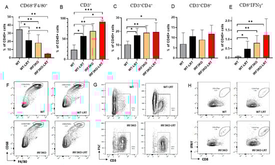 Flow cytometry analysis of immune cells infiltrated into AE17 tumors on day 20. (A,F) CD68+F4/80+ cells, (B,G) CD3+ cells, (C) CD3+CD4+ cells, (D) CD3+CD8+ cells, (E,H) CD8+IFNγ+ cells in the tumors; data are mean ± SEM (WT, WT-LRT, IRF3KO: n = 5 and IRF3KO-LRT: n = 3 per group). *, p < 0.05; **, p < 0.01; ***, p < 0.001, unpaired t test.