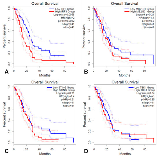 GEPIA2 survival analysis was carried out. The prognostic value of the expression of MB21D1, TMEM173, TBK1, and IRF3 mRNA in MPM was evaluated using the online database, Gene Expression Profiling Interactive Analysis 2 (GEPIA2) [17]. GEPIA2 is a web-based tool that delivers fast and customizable functionalities based on TCGA and genotype-tissue expression data, which contains the gene expression data and survival information of many cancer types. To analyze the overall survival (OS) of the patients, we set the median expression as the expression threshold to split the patient samples into high expression and low expression groups and used a Kaplan–Meier survival plot with the hazard ratio (HR), a 95% confidence interval (CI), and a log rank test p value. GEPIA2 is available at http://gepia2.cancer-pku.cn/ (accessed on 30 January 2021).